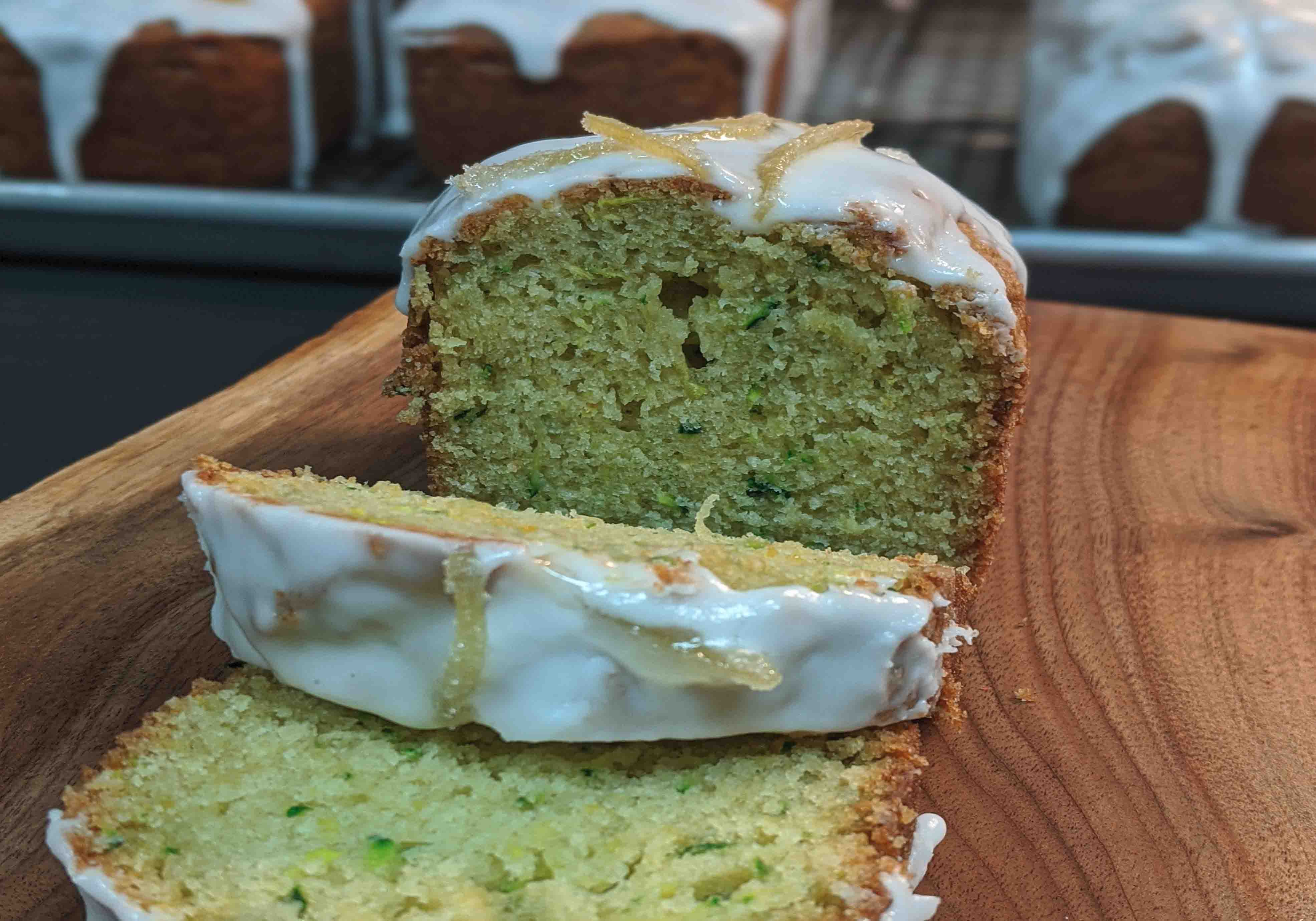 Sift all dry ingredients into medium sized bowl In a separate container whisk together eggs, olive oil, lemon juice, zest, ginger, and vanilla Create a well with the dry ingredients add wet ingredients to the center, use a spatula to incorporate the dry into the wet ingredients using a circular motion Add grated zucchini, continue mixing until completely incorporated Pour batter into prepared loaf pan Bake for approximately 30 minutesYou can also glaze the top. An easy glaze is whisking together 225 g of powdered sugar and 1 tablespoon lemon juice until smooth. Adjust to desired consistency, add more powdered sugar for a thicker glaze or more lemon juice for a thinner glaze.